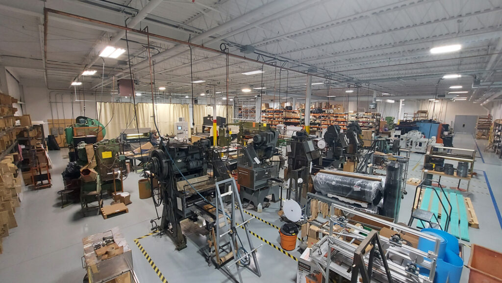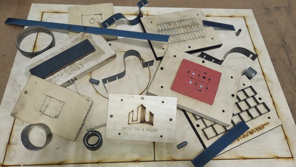 Our engineers will generate a DXF of your part in CAD, prepped with notches, proper punch sizing, and altered corner conditions when applicable. We will use the DXF to automatically CNC bend the steel rule blade(s) into shape with notches, cut to length, and mitered as needed. Our CO2 laser will also use the DXF to CNC cut the profile into plywood boards. The board and steel rule are carefully assembled, and any required punches are inserted, with foam rubber ejection material added last. We then make a first-piece hit in one of our 10 non-metal presses including beam, clicker, hydraulic, and 2 traveling head presses. The initial parts are fully inspected to the tolerances on your print prior to running your full production order. The entire process from order receipt, to DXF layout, to bending steel rule, to laser cutting board, to assembly, to first piece inspection, can occur in as little as 24 hours.
