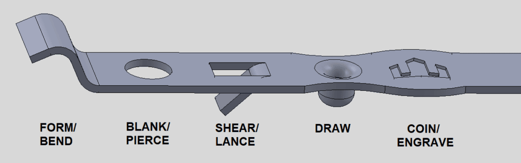 Metal Stampings are produced from strips of raw coiled stock fed through a tool known as a die which is actuated by a press. Multi-stage progressive dies are the most common but intricate dies, often used to achieve the desired part geometry over a series of stages/stations at a set pitch. Compound dies can be used to create (often flat) internal and external features (like a washer) in a single station. Other single-station tools require manually loading a blank instead of feeding a coil and individually cycling the press to alter the part. There are a variety of operations such as blanking, forming, coining, and deep drawing used to achieve the desired part geometry.
